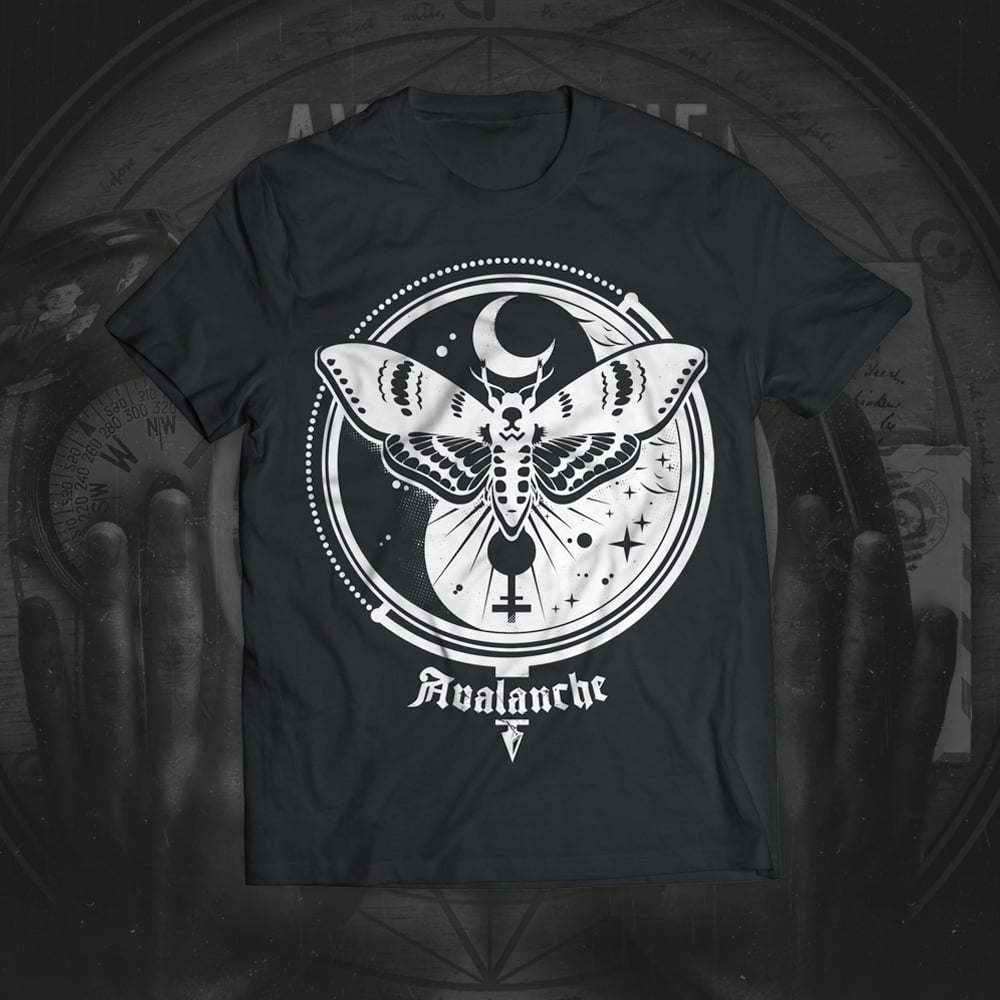 Moth (Black Tee) printed on Gildan Softstyle Adult T-shirt (Unisex).